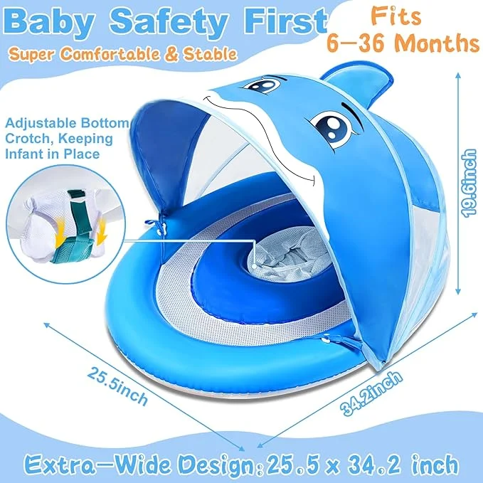 The cutting-edge UPF50+ sun canopy on this top baby swim ring offers exceptional defense against damaging UV rays. Parents can adjust sun coverage according to the time of day and changing conditions thanks to the adjustable canopy system’s flexible positioning, which ranges from 0 to 120 degrees.The canopy has several advantageous features, including: