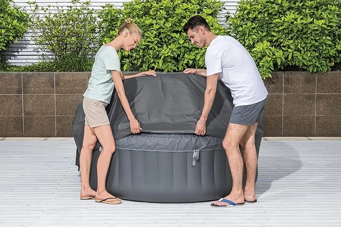 This Saluspa insulated cover is made especially for round spas up to 71″ x 26″ and works flawlessly with well-known models, such as the Saluspa Helsinki AirJet Inflatable Spa. While preserving the snug fit necessary for maximum energy efficiency, the exact sizing guarantees ideal thermal performance. The engineered compatibility eliminates gaps and air leaks that impair the generic covers’ thermal performance. This precise fit ensures simple installation and removal for spa access while optimising the effectiveness of the double-layer insulation.