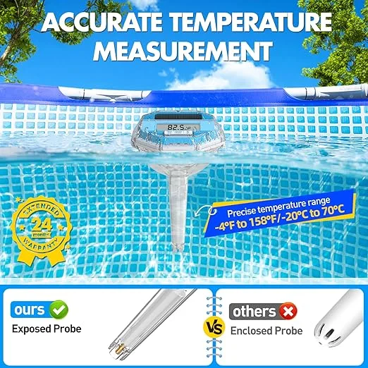 This digital hot tub thermometer is constructed with cutting-edge sealing technology and has an IP68 waterproof rating, which is the highest protection level available. The improved waterproofing outperforms comparable products available on the market, guaranteeing that no water intrusion can harm internal components. Its sturdy design ensures enduring performance over several pool seasons, making it a dependable partner for years of fun.