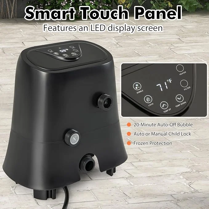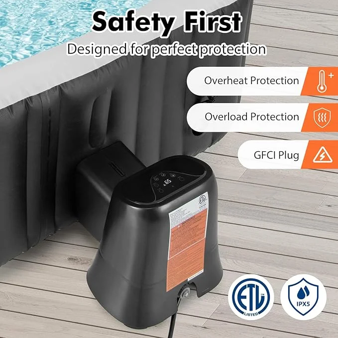 Change your inflatable hot tub experience into luxury with this professional-grade all-in-one spa management system. The super advanced hot tub heater pump gives strong heating, soothing bubble massage, and smart filtration all together as one high-tech control center. Made just right for inflatable hot tubs, this easy-to-carry hot tub pump and heater brings you top-quality performance with new conveniences and full safety features.