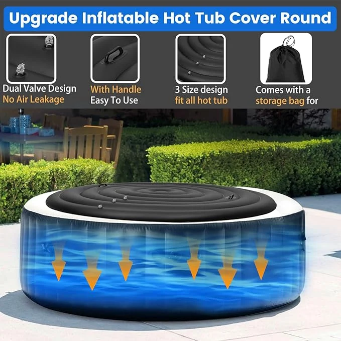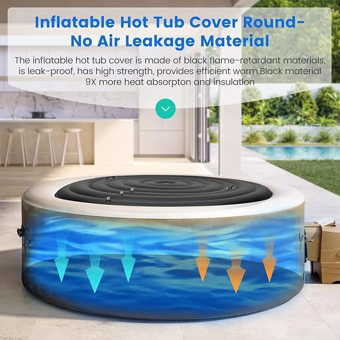 The fully improved materials used in our inflatable hot tub insulated cover solve common air leakage problems. By using reinforced seam technology and puncture-resistant materials that maintain optimal inflation for extended periods, the improved construction allays durability concerns.By securing air inside the cover, the novel 3-way inflation port system avoids gradual deflation that reduces thermal efficiency. Throughout the cover’s life, reliable performance is guaranteed by this safe sealing system.
