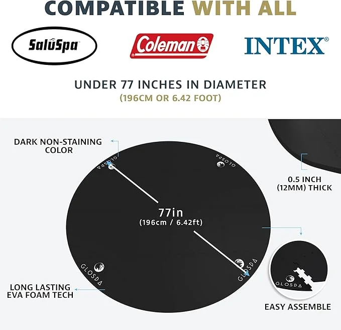 Our 77-inch hot tub mat has a circular design that fits all popular inflatable hot tub brands, including Saluspa models such as Miami, Cancun, Fiji, Madrid, Zurich, St.Lucia, Milan, Hawaii, Helsinki, Palm Springs, Ibiza, Bahamas, Bali, Havana, Barbados, Vancouver, Tahiti, Aruba, and Hollywood.It also fits all Coleman and Intex hot tubs, which are 77 inches or less in size. This goes with everything and fits well, no matter what the size is. The 77-inch-long by 77-inch-wide cover makes sure all of the round spas are taken care of.