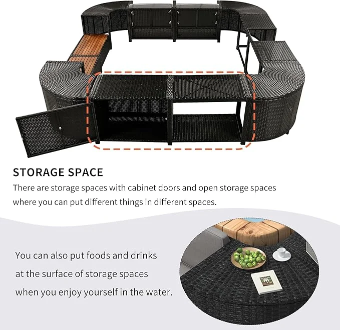 The strong steel and rattan frame make it suitable for use outside and will last a long time. It strikes an ideal balance between strength and beauty, a quality that wooden hot tub surrounds often lack. Each seating section can accommodate up to 352 pounds, while the storage compartments can safely handle 176 pounds. Plastic leg materials resist moisture and UV damage, maintaining their strength over the seasons of use.