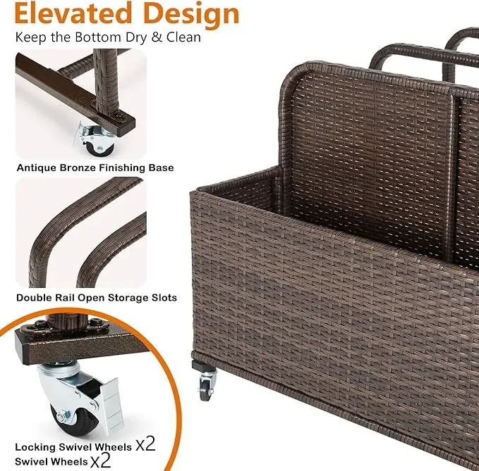 The cleverly designed three-compartment arrangement of our pool toy storage rack optimises efficiency and organisation. Pool floats, pool noodles, and large objects are safely held in two open side sections with tightly wrapped hand-woven wicker rails, which also provide adequate air circulation for speedy drying. Smaller items like cushions, squirt guns, life jackets, pool toys, and other pool accessories can be stored inside the full wicker basket that serves as the focal point. This multipurpose compartment provides easy access when needed while shielding priceless items from the elements. Among the storage capacities are: